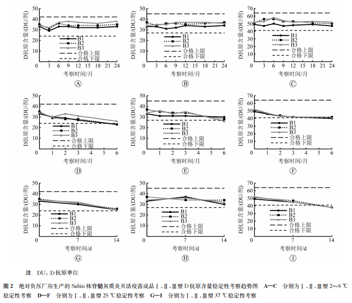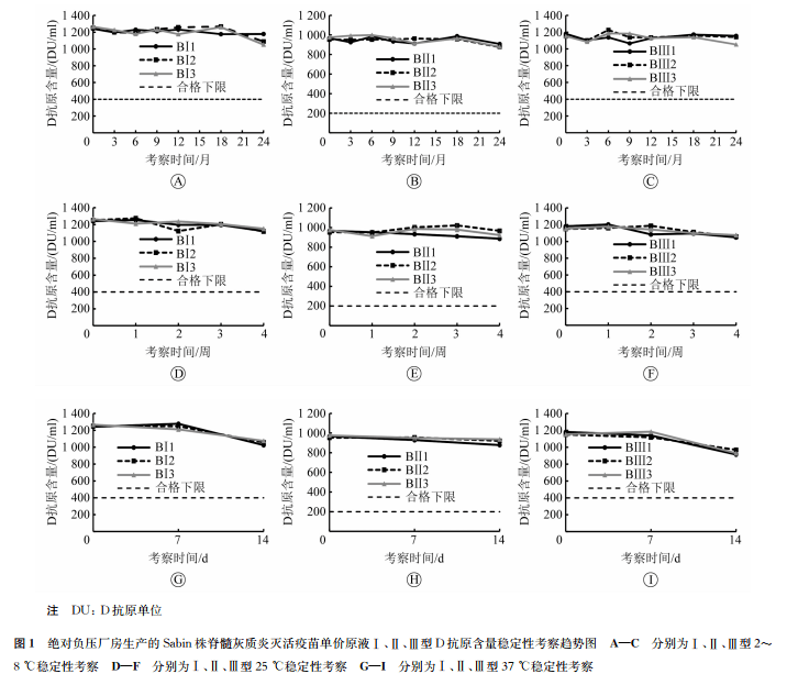 结果绝对负压厂房生产的单价原液中Ⅰ、Ⅱ和Ⅲ型D抗原含量分别为≥400、≥200、≥400 D抗原单位(D-antigen unit,DU)/ml,半成品中分别为48~84、54~90、82~128 DU/ml,成品中分别为24~42、27~45、41~64 DU/剂,各项检测结果均符合企标要求;供试品半成品半数有效剂量(50% effective dose,ED 50 )均高于参考品,且效力试验结果(供试品与参考品ED 50 比)均在警戒限内波动。相对负压与绝对负压厂房生产的sIPV原液、半成品、成品中Ⅰ、Ⅱ和Ⅲ型D抗原含量及半成品效力试验结果的差异无统计学意义( t 值分别为-0.96、-1.69、-1.07、1.61、-0.85、0.07、0.00、-0.66、-1.04、1.93、0.83、1.31, P 值均>0.05)。稳定性考察结果显示,在疫苗有效期内的各个考察时间点的所有检测结果均符合企标的要求。