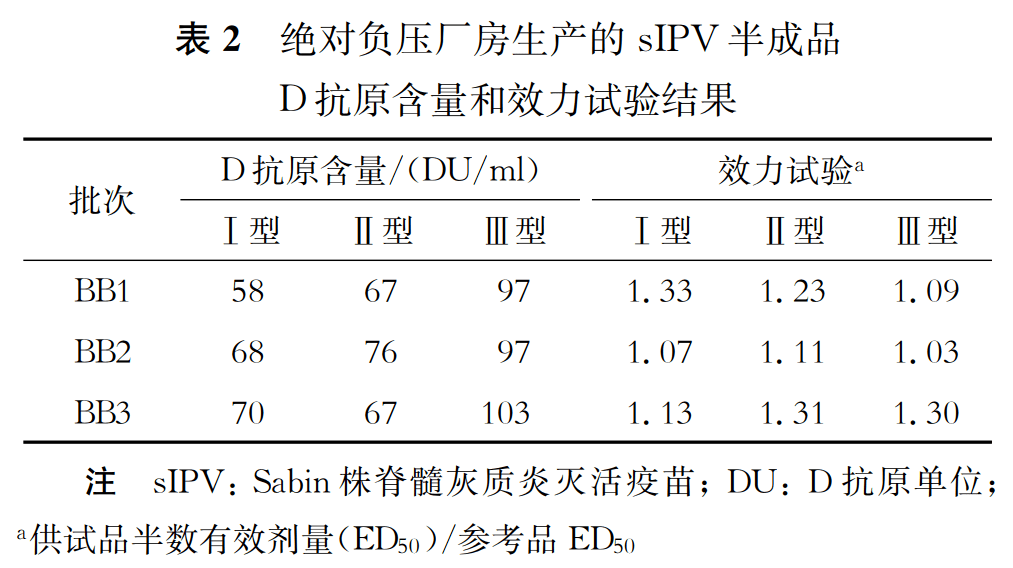 2.1.2 三价半成品绝对负压厂房生产的sIPV三价半成品BB1—BB3检测结果均符合企标要求,其中D抗原含量及效力试验结果见表2。