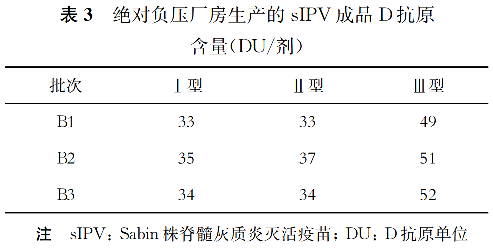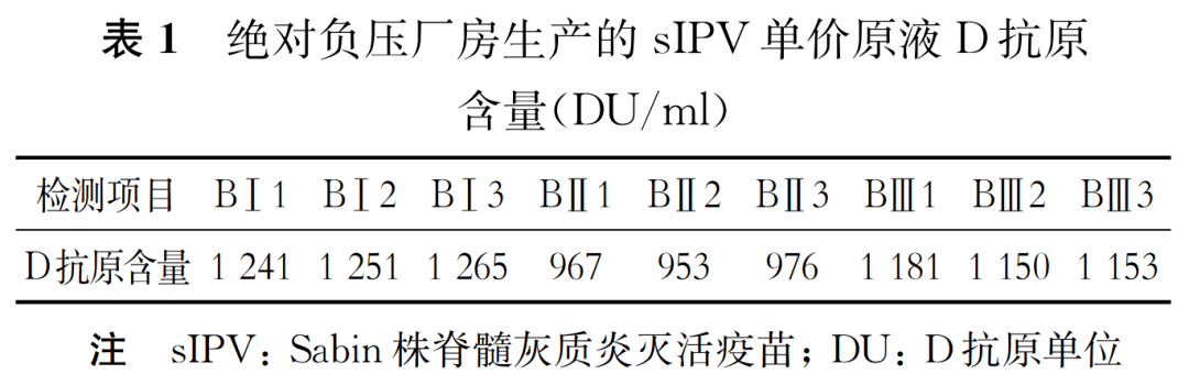 2.1.1 单价原液绝对负压厂房生产的3个型别sIPV单价原液各3批的检测结果均符合企标的要求,其中D抗原含量见表1。