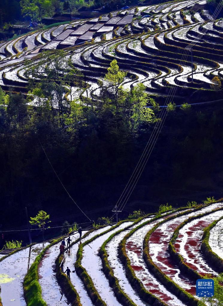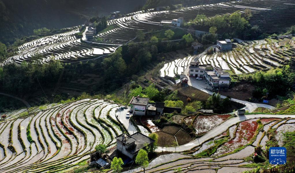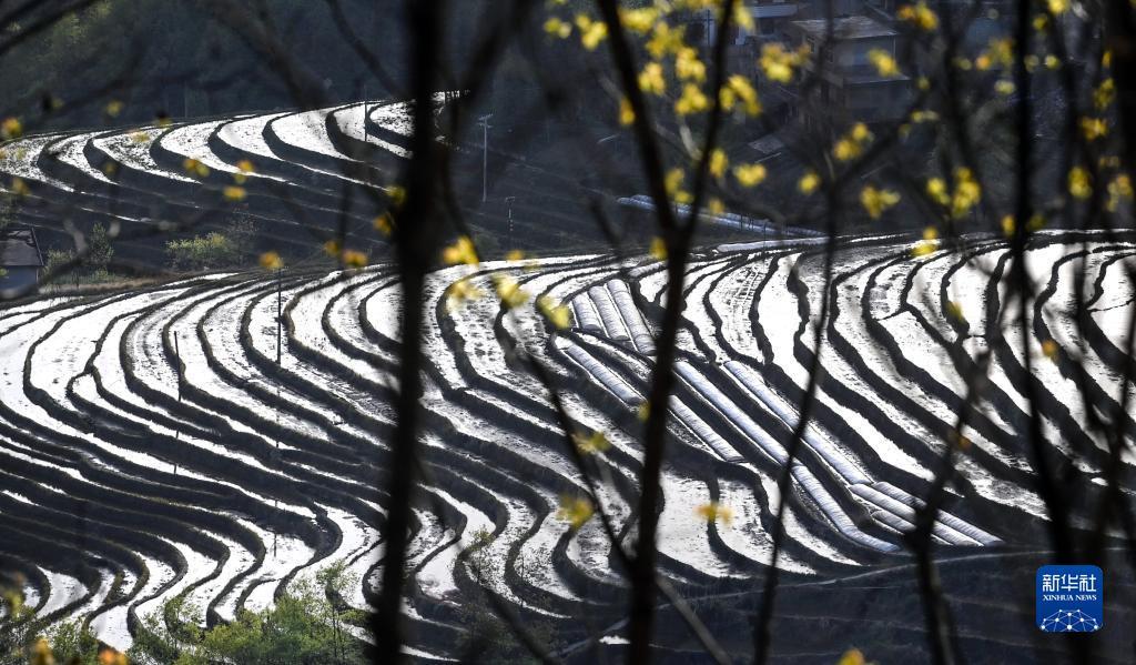 近日,在陕西省安康市岚皋县南宫山镇桂花村,因春灌备耕,沿山势自上而下层层铺叠的千亩梯田,仿佛戴上了一串串银链,构成了一幅优美的田园风光图。