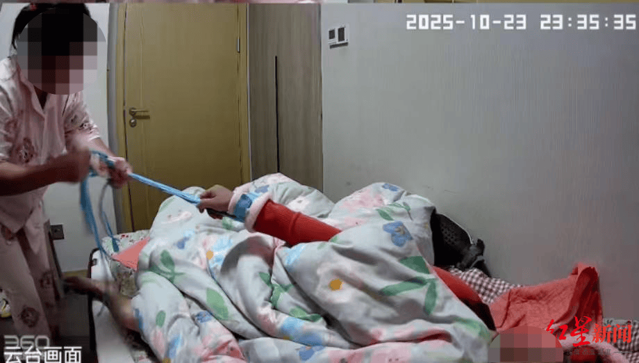 朱先生称,后来他们查看监控发现,仅仅在10月23日至25日几天内,李某某就存在辱骂、捆绑拖拽、用被子堵住老人口鼻等虐待老人的行为。