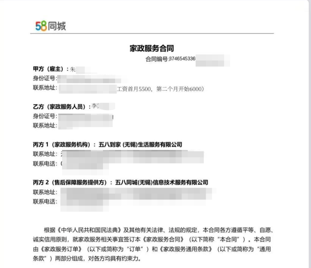 朱先生与李某某和服务机构58到家签订的《家政服务合同》显示,李某某工资首月5500元,第二个月开始6000元,服务内容为做一日三餐、买菜、熨烫衣服、洗衣服、打扫卫生和照顾老人,服务期限为两年,月休四天。