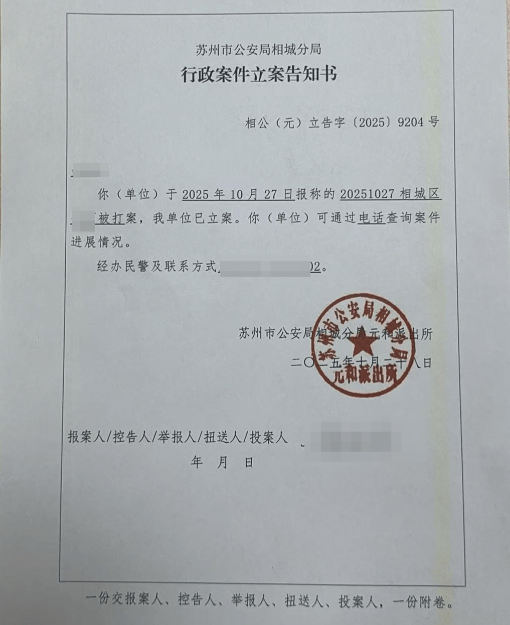 朱先生提供的警方立案告知书显示,10月27日,家属报案,10月28日,“樊某被打案”已在苏州市公安局相城分局立案调查。