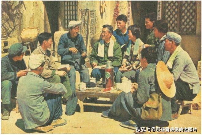 重新学习的极好机会——五七干校是思想培养、教育革命干部的新型学校。陕西省西安市南泥湾五七干校学员在南泥湾公社三台庄大队插队劳动期间,虚心向贫下中农学习,进行社会调查。这是他们在听大队党支部书记曹怀秀讲村史、讲路线。《人民日报》记者