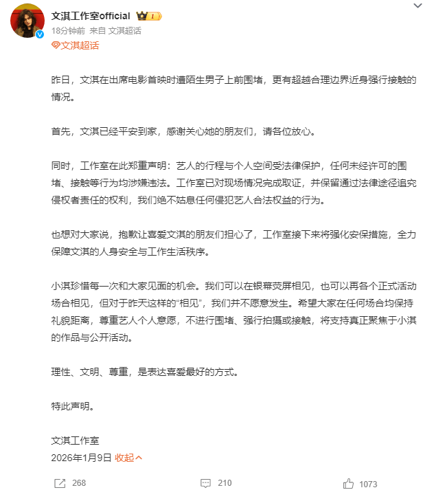 也想对大家说,抱歉让喜爱文淇的朋友们担心了,工作室接下来将强化安保措施,全力保障文淇的人身安全与工作生活秩序。