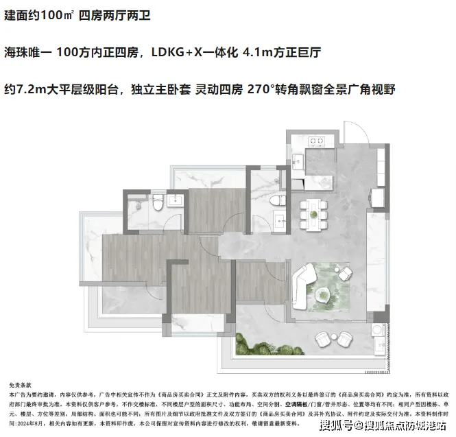 100㎡四房两厅两卫户型,是区域内少有的100㎡内正四房产品,精准匹配多孩家庭的居住需求。户型设计方正实用,4.1米的方正客厅连接7.2米的大阳台,晾晒和休闲功能互不耽误,大阳台还能改造成休闲茶座或亲子玩乐区,拓展了生活空间。主卧同样配备270°转角飘窗,采光充足,视野开阔,为业主打造了专属的私密舒适空间。四房设计能轻松容纳一家四口甚至三代同堂的居住需求,每个家庭成员都能拥有独立的生活空间。