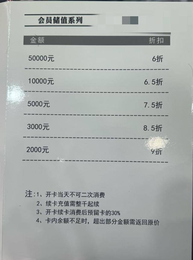 除了价格套路,严苛的充值规则也让不少消费者诟病。当记者两人选好资生堂护发烫染套餐后,总价格为9690元,店员提出充值一万,充值金额不能低于消费金额,充值一万后打五折。随后记者前往其他店家,调查发现,多家中高端店铺都设有明确的充值要求:开卡当天不可进行二次消费;续卡充值需以整千为单位起续,不支持零散金额补充;开卡或续卡消费后,需预留卡内金额的30%不可动用;当卡内余额不足支付单次消费时,超出部分金额需按原价结算,而非享受会员折扣。这些规则极大地限制了消费者的消费自主权,不少消费者吐槽“办卡容易用卡难”,相当于被强制绑定长期消费。