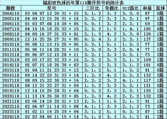 在第118期历史同期奖号中,红球三区分布总比例为49:38:39,奇偶总比例为68:58,012路比为46:43:37,和值分布在41-137之间,蓝球号码012路总比例为5:8:8。